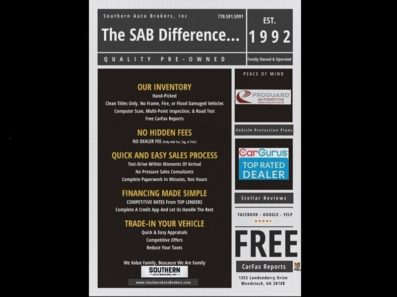 Please visit our website at www.SouthernAutoBrokers.com to See More Pictures, Get Additional Information, and View a FREE CarFax Report. You can Apply for Financing on our website safely and securely. We partner with outside lenders. Loan Approval, Terms, and Stipulations are based on your credit history by the lender. Call us at 770-591-5991 with any questions or to schedule a Test Drive! Family Owned and Operated since 1992! No Dealer Fee! Check google for the most updated hours and holiday schedule. DEALER makes no representations, expressed or implied, to any actual or prospective purchaser or owner of this vehicle as to the existence, ownership, accuracy, description or condition of the listed vehicle''s equipment, accessories, price, specials or any warranties. Any and all differences must be addressed prior to the sale of this vehicle. Your actual mileage will vary depending on how you drive and maintain your vehicle.